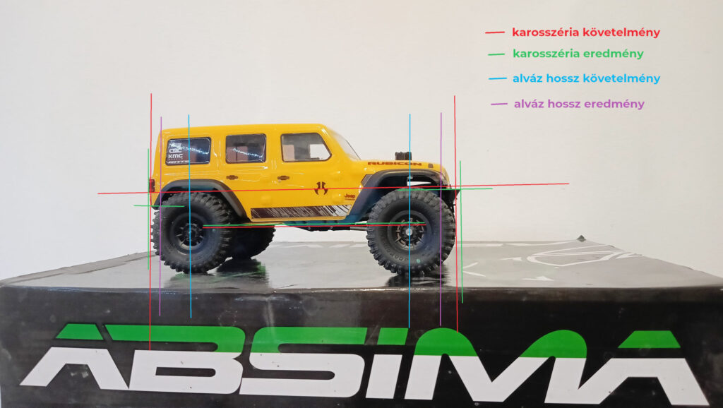 | Karoséria | Karoséria môže byť vyrobená z akéhokoľvek materiálu (lexan, ABS, 3D tlač a pod.). Šírka karosérie musí byť pri dverách kabíny väčšia ako vnútorný okraj všetkých štyroch pneumatík. Spodná hrana prednej masky a zadných dverí/batožinového priestoru musí byť pod horným okrajom všetkých štyroch pneumatík, keď vozidlo stojí na rovnej zemi. Spodná hrana karosérie musí byť v takej výške, aby pri pohľade zboku nebolo vidieť rozvodovku. Predná a zadná časť karosérie musí presahovať predný okraj predných pneumatík a zadný okraj zadných pneumatík. Toto je možné dosiahnuť aj nárazníkmi namontovanými na podvozku, ak samotná karoséria nespĺňa požiadavky. Lexanová karoséria musí mať čelné sklo a zadné okno. Bočné okná môžu byť vyrezané. Karosérie s ochrannou klietkou namiesto kabíny (napr. Axial Deadbolt) nemusia mať čelné ani zadné sklo. Nie sú povolené trubkové alebo „Warthog“ konštrukcie. |